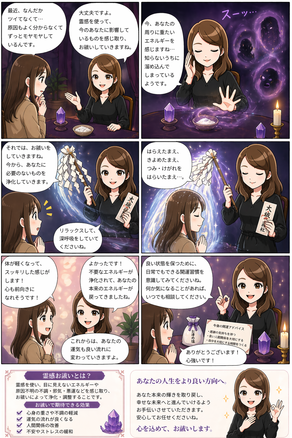 【お祓い・浄化セッション/ブロック開放セッションのご案内】 霊能者・占い師の 暁 真凰(あかつき まお)です。 当サロンでは、 「お祓い・浄化」と「ブロック開放」を組み合わせ、 あなた様に必要な本来の状態へ整えるセッシ...